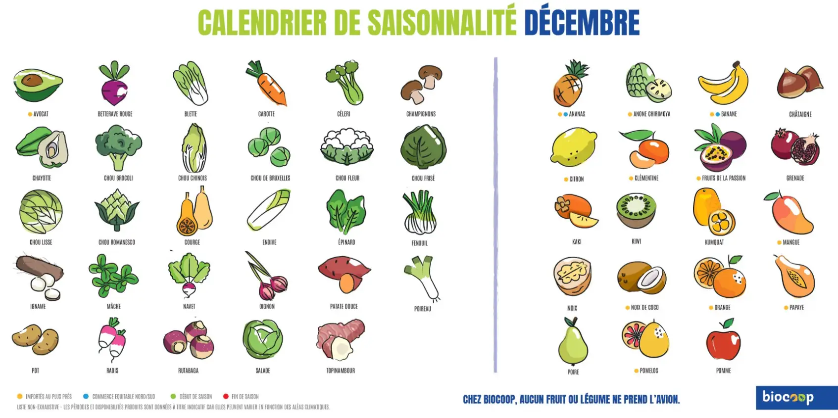 Parce que manger des produits de qualité rime avec respect de la saisonnalité, Biocoop a élaboré un calendrier de saisonnalité pour ses fruits et légumes bio.